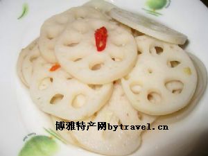 糖拌莲下藕,湖区群众称“棰藕”。7月上旬,荷花初放,莲下根茎方作藕一节,形如鸡卵。此时,为拌制莲下藕