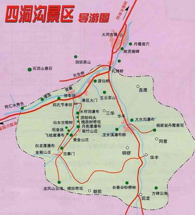 1、)概要:四洞沟风景区位于赤水西南17公里处,距大同镇5公里,在景区四洞沟一段约四公里的河道上,按大致相等的距离排列着四级跌水瀑布,姿态各异。每一瀑后都有一洞穴,形成四处 “水帘洞”景观,四洞沟也因